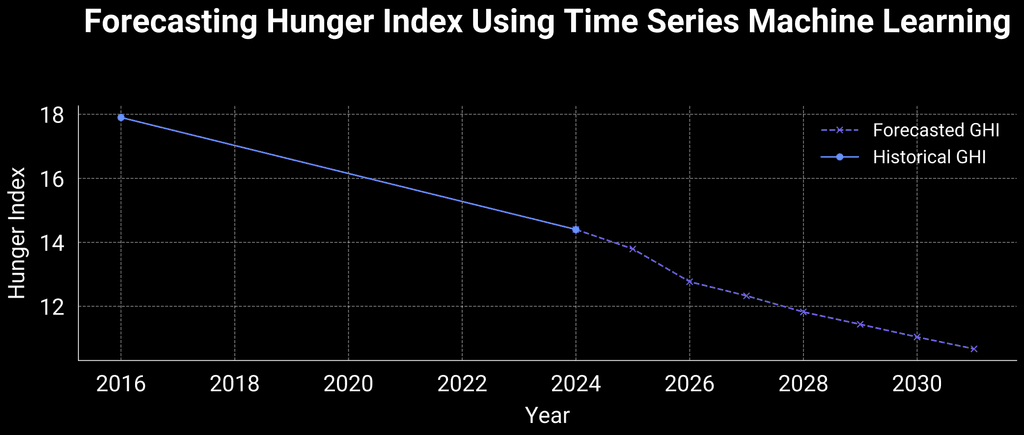 This projection is generated using a time series machine learning approach—specifically a linear regression model. The forecast anticipates a continued downward trajectory in the hunger index, projecting that the Philippines may reach even lower GHI levels by 2030 if present conditions and policy interventions persist. The results support optimism for continued improvement, though they also emphasize the importance of sustained efforts to maintain this momentum.
